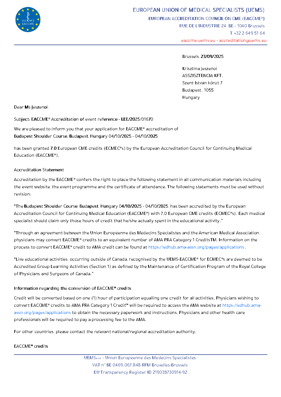 As in previous years, we will be honoured to have eminent personalities of national and international shoulder surgery as lecturers. Participants will have the opportunity to receive up-to-date information on the indications for reverse shoulder replacement surgery, the different types of prosthesis, surgical tips and tricks and post-operative rehabilitation. During the different workshops we will show surgical planning, during the case discussions we will go through the steps of the surgery and the rehabilitation process. Finally, in the wet-lab, participants will have ample opportunity to put the theoretical knowledge they have acquired into practice with the help of highly experienced and trained shoulder surgeons.